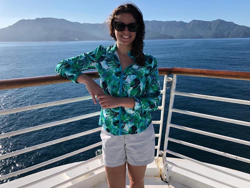 Dr. Amanda Goodheart Parks at the bow during a cruise to the Caribbean, 2023.