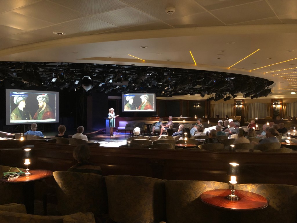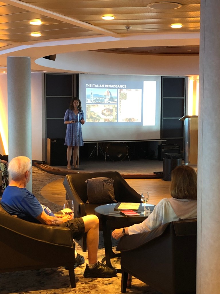 Dr. Amanda Goodheart Parks delivering a Mediterranean/Adriatic cruise enrichment lecture, 2024.