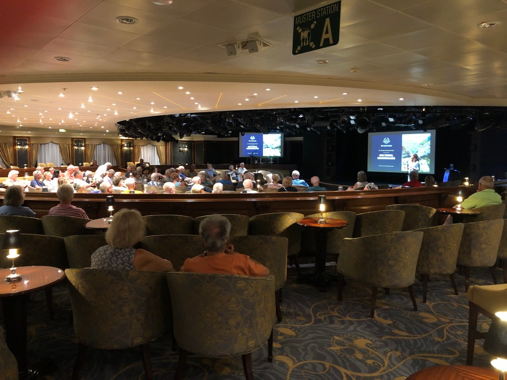 Dr. Amanda Goodheart Parks delivering a Western Caribbean cruise enrichment lecture, 2024.