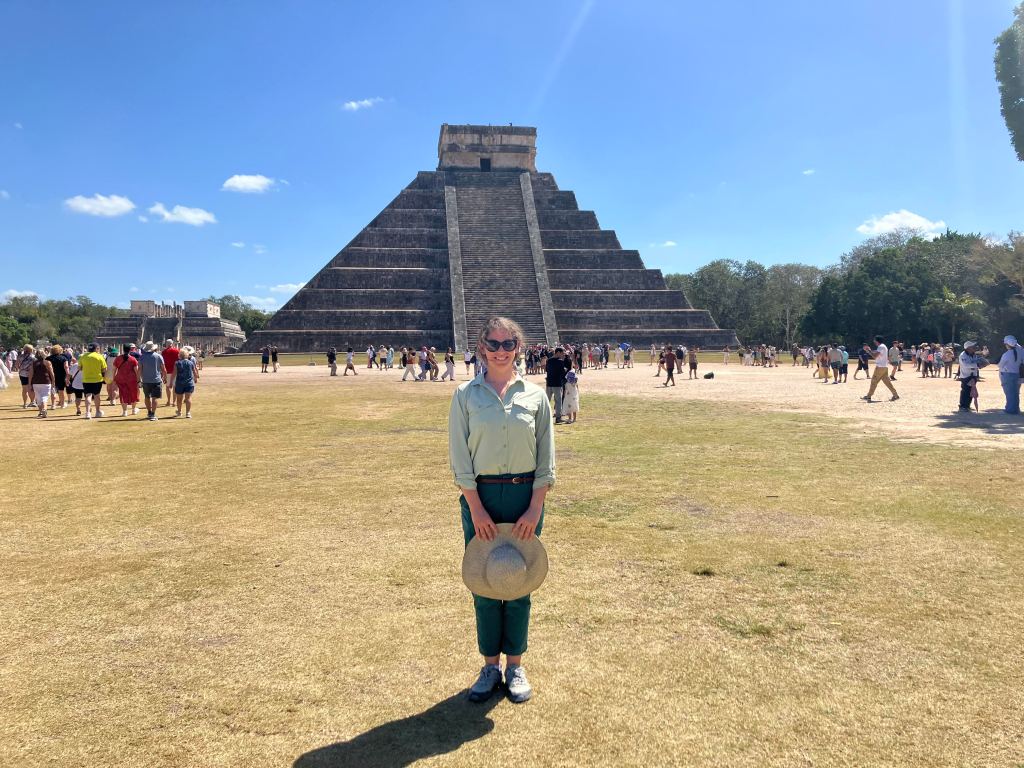 Dr. Amanda Goodheart Parks and the Temple of Kukulcán at Chichén Itzá during a recent research trip to the Yucatan Peninsula.